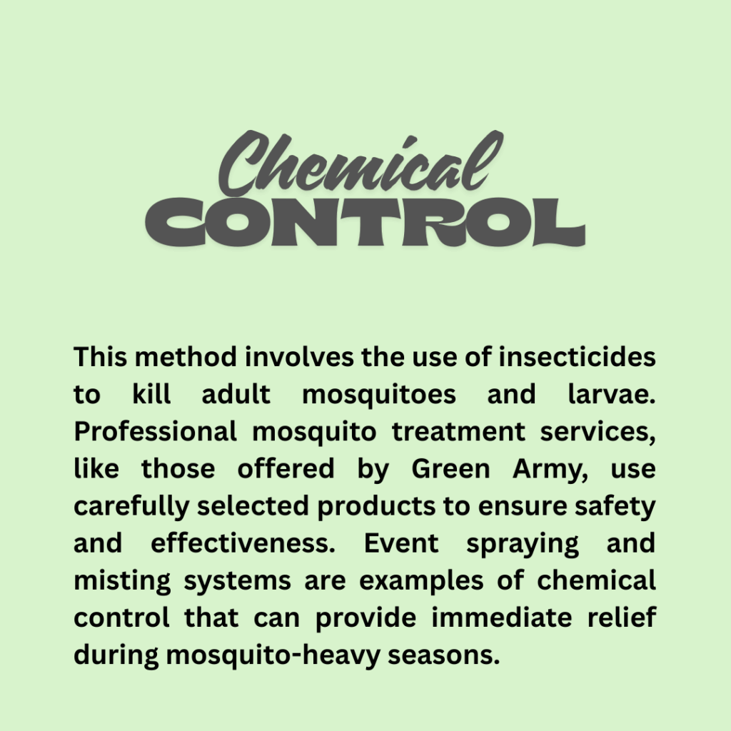 For outdoor spaces, professional mosquito treatment and event spraying services provided by Green Army use advanced formulations and misting systems to control mosquitoes on a large scale. These services target mosquito populations directly around your property, significantly reducing the risk of bites during outdoor events or daily activities.
