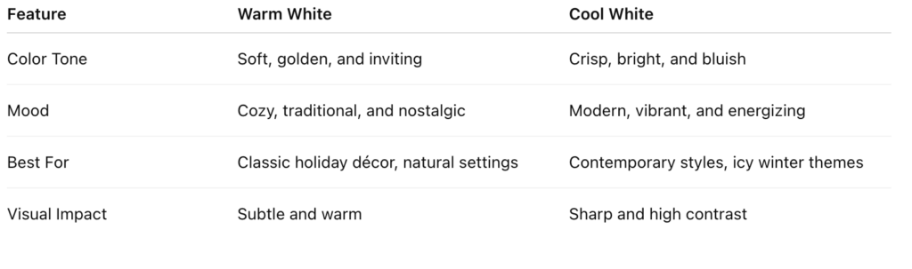| Ideal if you want to create a welcoming atmosphere that feels like a traditional holiday. They work especially well with natural decorations like pine branches, wreaths, and wooden accents. Warm white is also great for outdoor spaces where you want your home to feel inviting and neighbor-friendly. | Offer a brighter and more modern look. They are perfect if you prefer a clean, sleek style or if you want your lights to stand out sharply against dark backgrounds. Cool white can also be a good choice for business lighting or commercial displays where visibility is important. |